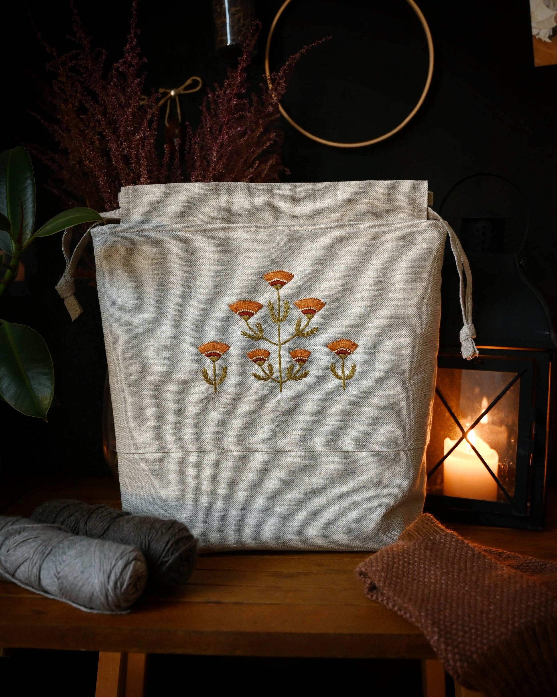 Large size knitting project bag with embroidered motif with three pockets inside and drawstring closure. It fits 6 100g skeins of yarn comfortably. Perfect for medium/large projects, like shawls, cowls, cardigans or any other similar sized signs of love and care :) Squared off bottom for stability and space. Interfaced. Lined with black linen fabric. Has a tab with metal detail for your favorite progress keeper.