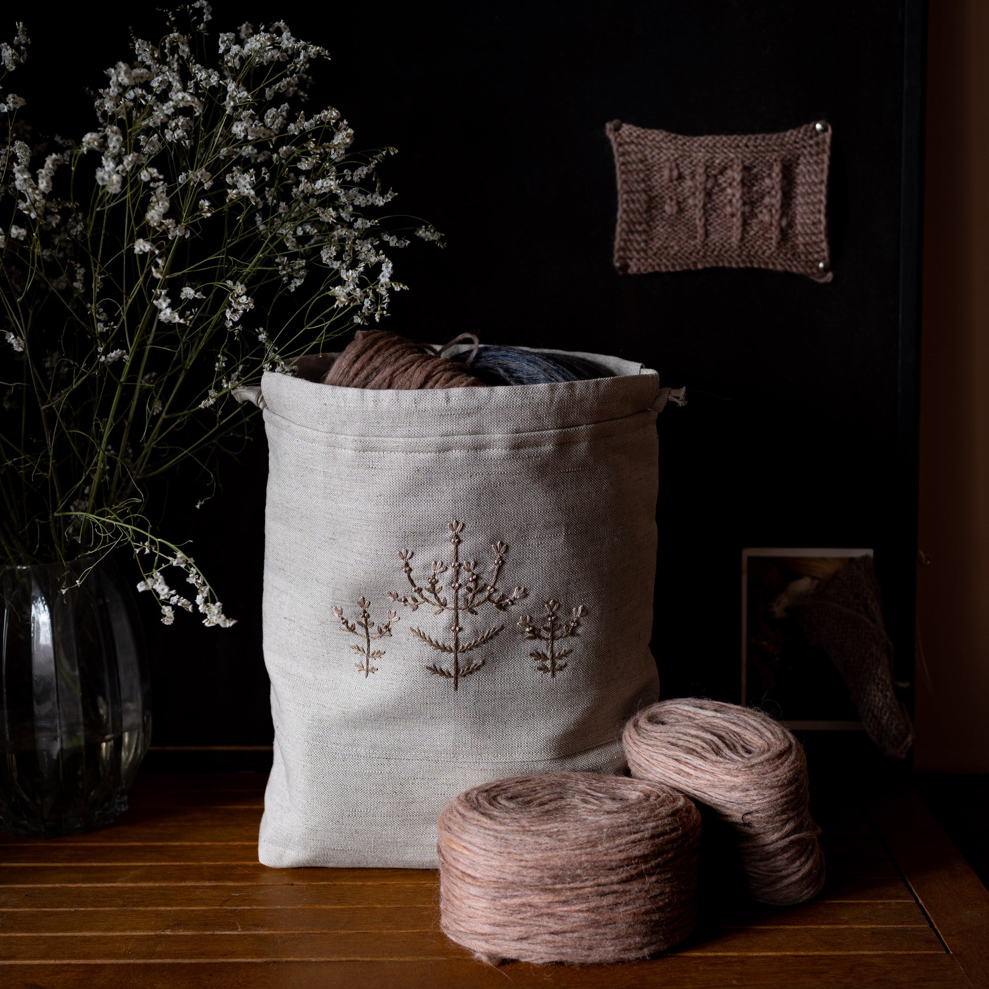 Large size knitting project bag with embroidered motif with three pockets inside and drawstring closure. It fits 6 100g skeins of yarn comfortably. Perfect for medium/large projects, like shawls, cowls, cardigans or any other similar sized signs of love and care :) Squared off bottom for stability and space. Interfaced. Lined with black linen fabric. Has a tab with metal detail for your favorite progress keeper.