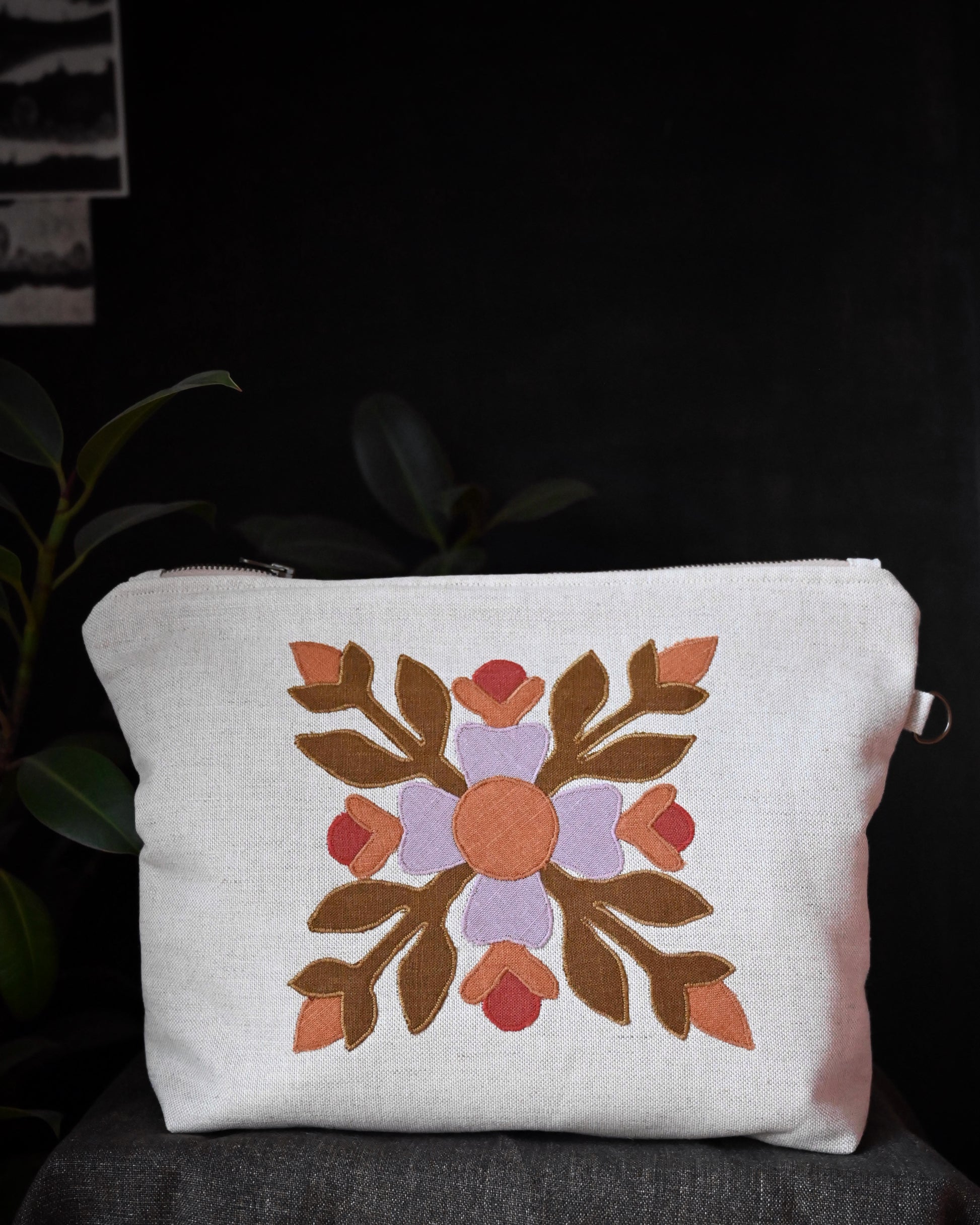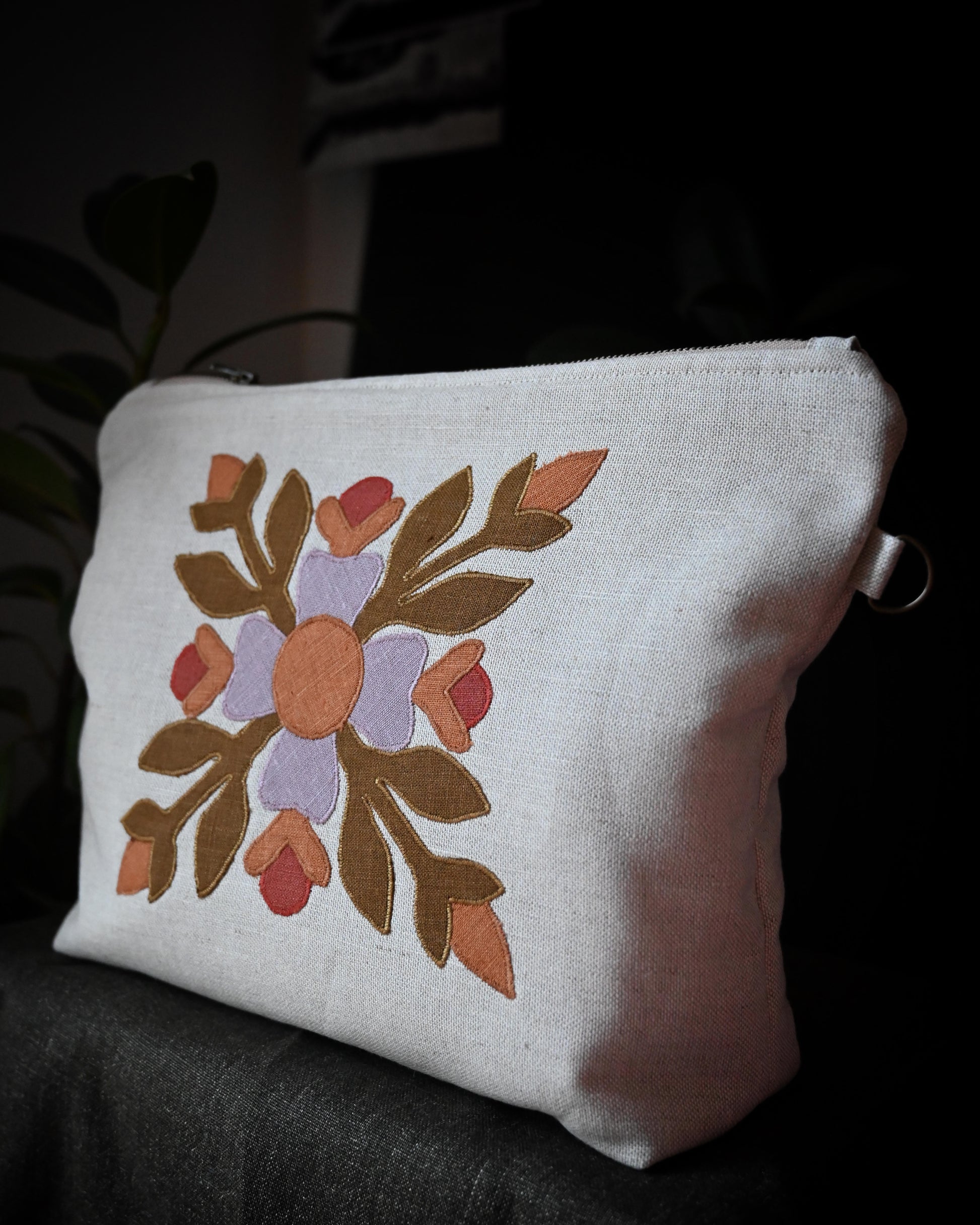 Large size knitting project bag with appliqué motif with three pockets inside and zipper closure. It fits 5 100g skeins of yarn comfortably. Perfect for medium/large projects, like shawls, cowls, cardigans or any other similar sized signs of love and care :) Squared off bottom for stability and space. Interfaced. Has a tab with metal detail for your favorite progress keeper.