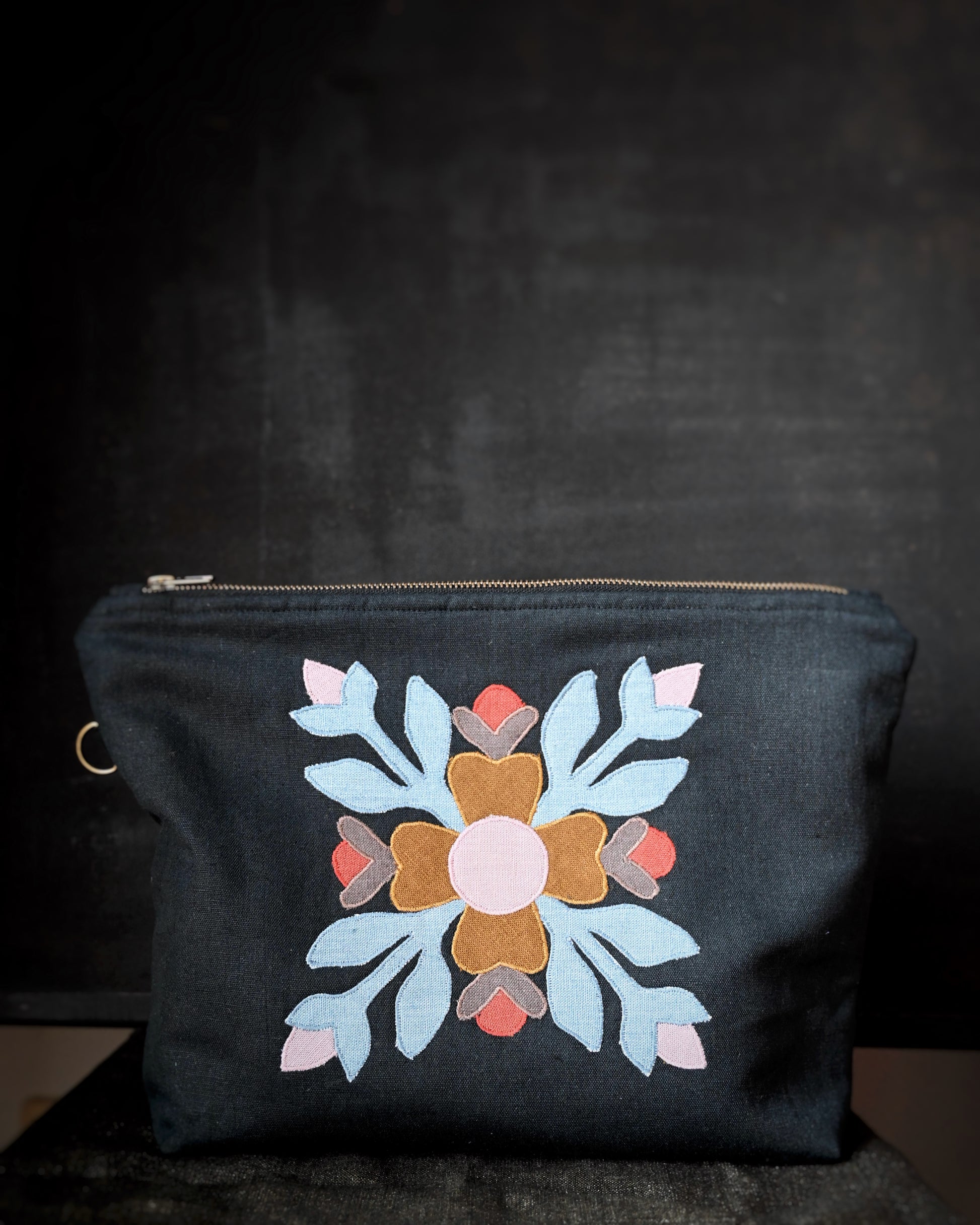 Large size knitting project bag with appliqué motif with three pockets inside and zipper closure. It fits 5 100g skeins of yarn comfortably. Perfect for medium/large projects, like shawls, cowls, cardigans or any other similar sized signs of love and care :) Squared off bottom for stability and space. Interfaced. Has a tab with metal detail for your favorite progress keeper.