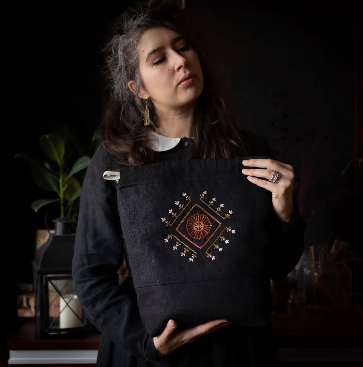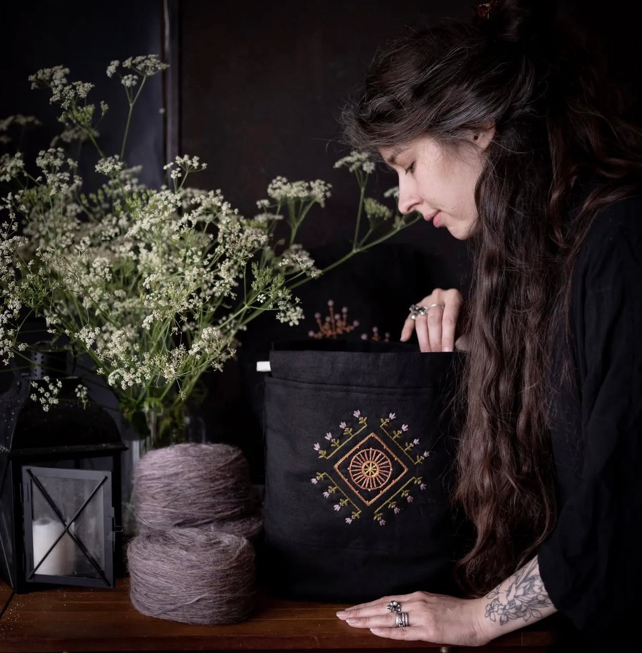 Large size knitting project bag with embroidered motif with three pockets inside and drawstring closure. It fits 6 100g skeins of yarn comfortably. Perfect for medium/large projects, like shawls, cowls, cardigans or any other similar sized signs of love and care :) Squared off bottom for stability and space. Interfaced. Lined with black linen fabric. Has a tab with metal detail for your favorite progress keeper.