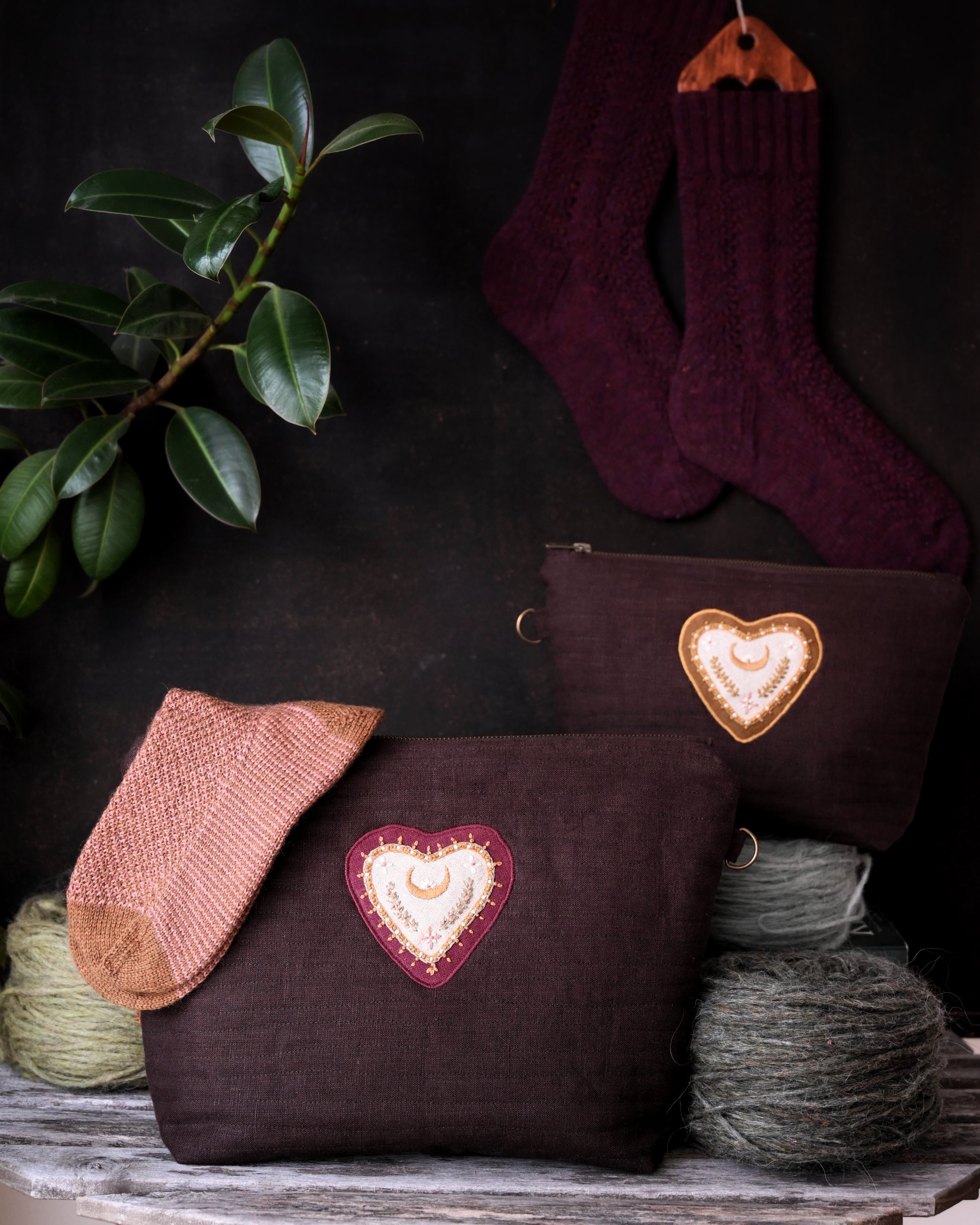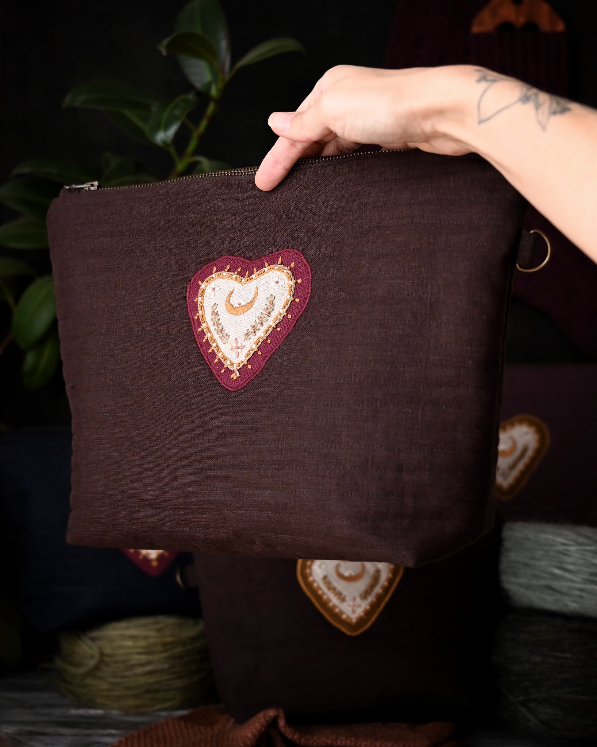 Large size knitting project bag with appliqué motif with three pockets inside and zipper closure. It fits 5 100g skeins of yarn comfortably. Perfect for medium/large projects, like shawls, cowls, cardigans or any other similar sized signs of love and care :) Squared off bottom for stability and space. Interfaced. Has a tab with metal detail for your favorite progress keeper.