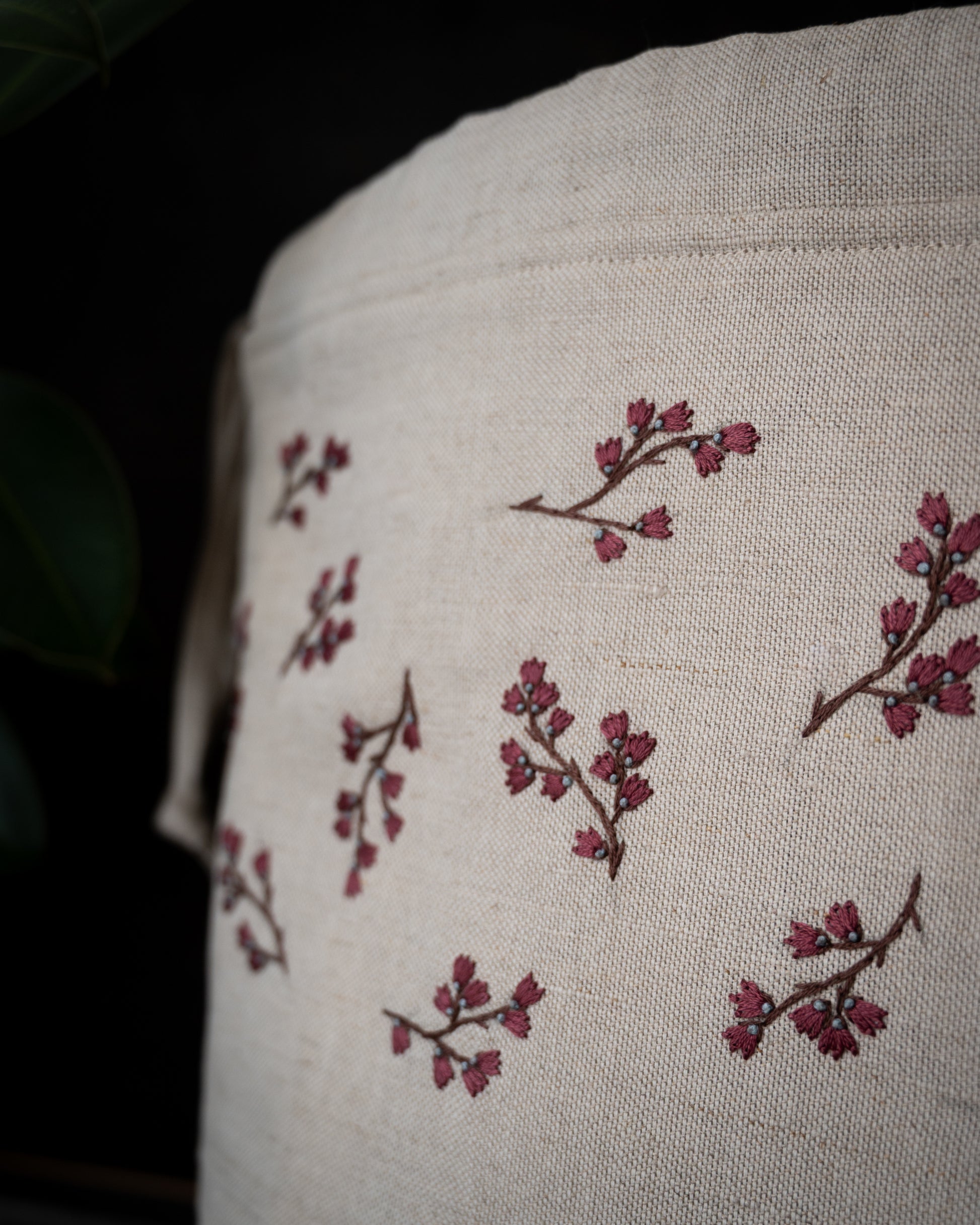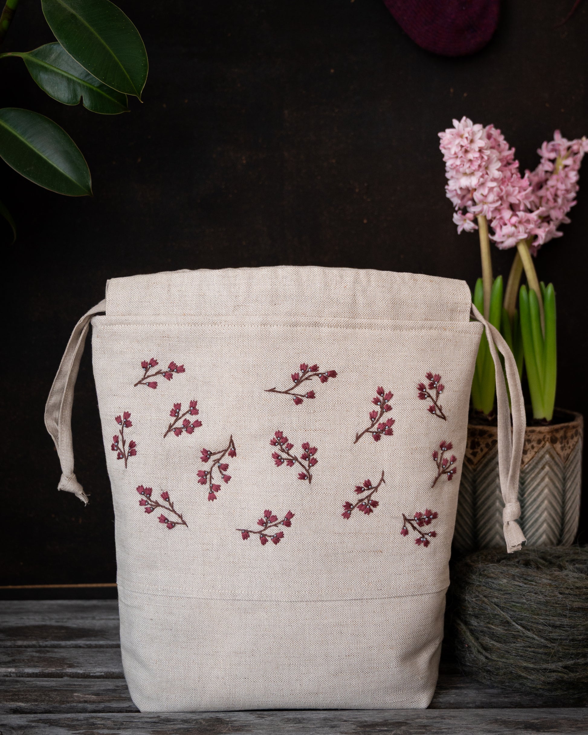 Large size knitting project bag with embroidered motif with three pockets inside and drawstring closure. It fits 6 100g skeins of yarn comfortably. Perfect for medium/large projects, like shawls, cowls, cardigans or any other similar sized signs of love and care :) Squared off bottom for stability and space. Interfaced. Lined with black linen fabric. Has a tab with metal detail for your favorite progress keeper.
