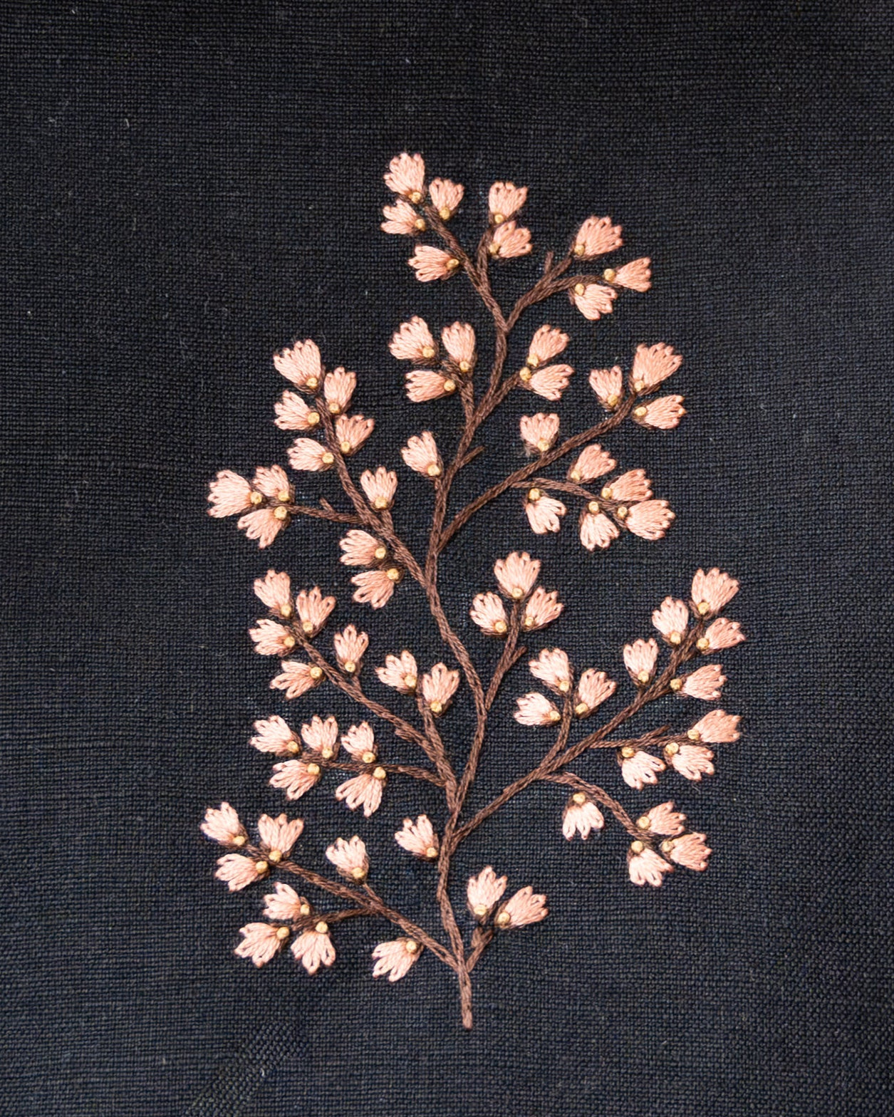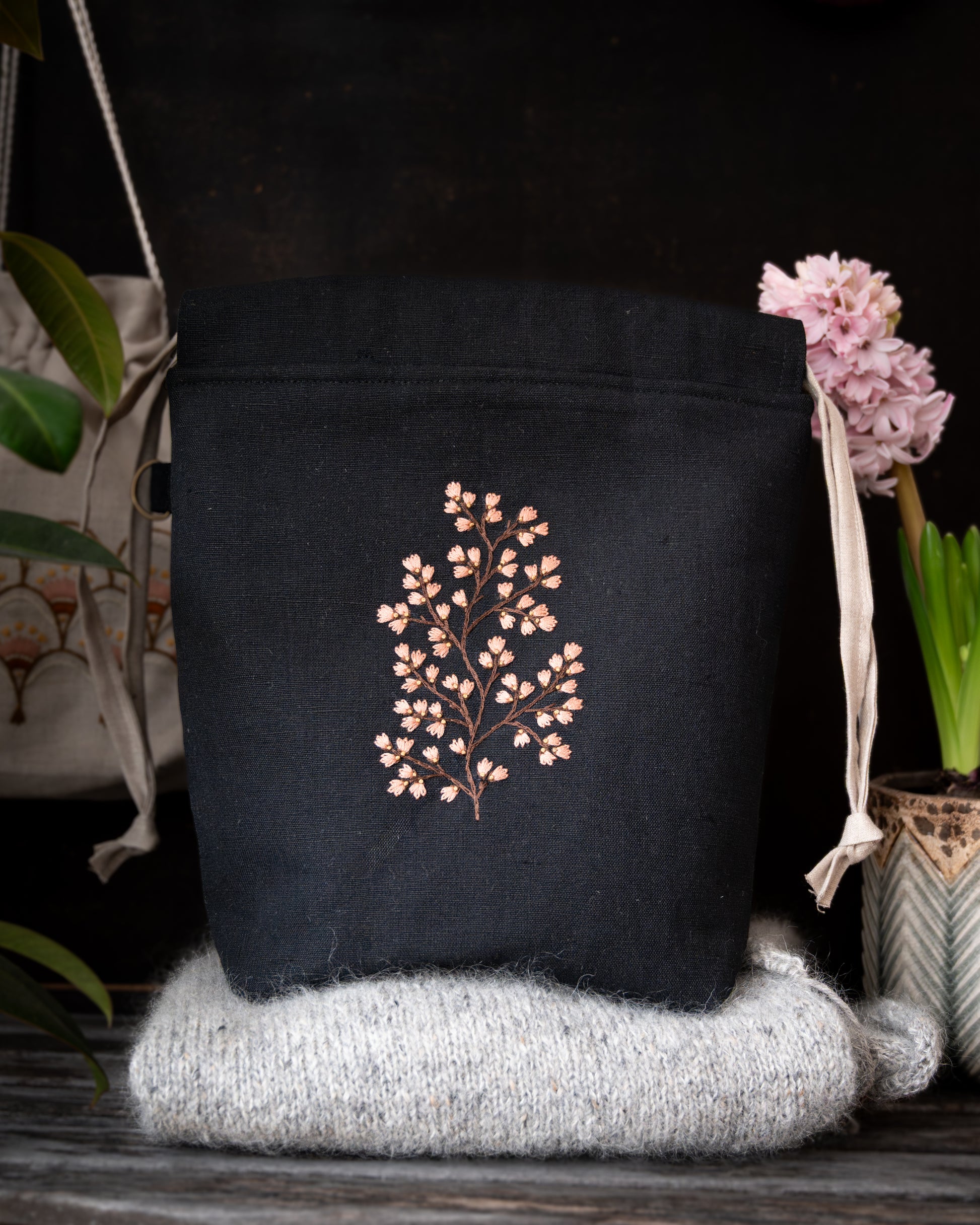 Small size knitting project bag with embroidered motif with two pockets inside and drawstring closure. It fits 2 100g skeins of yarn comfortably. Perfect for small projects, like mittens, socks, hats or any other similar sized signs of love and care :) Squared off bottom for stability and space. Interfaced. Lined with off-white striped cotton fabric. Has a tab with metal detail for your favorite progress keeper.
