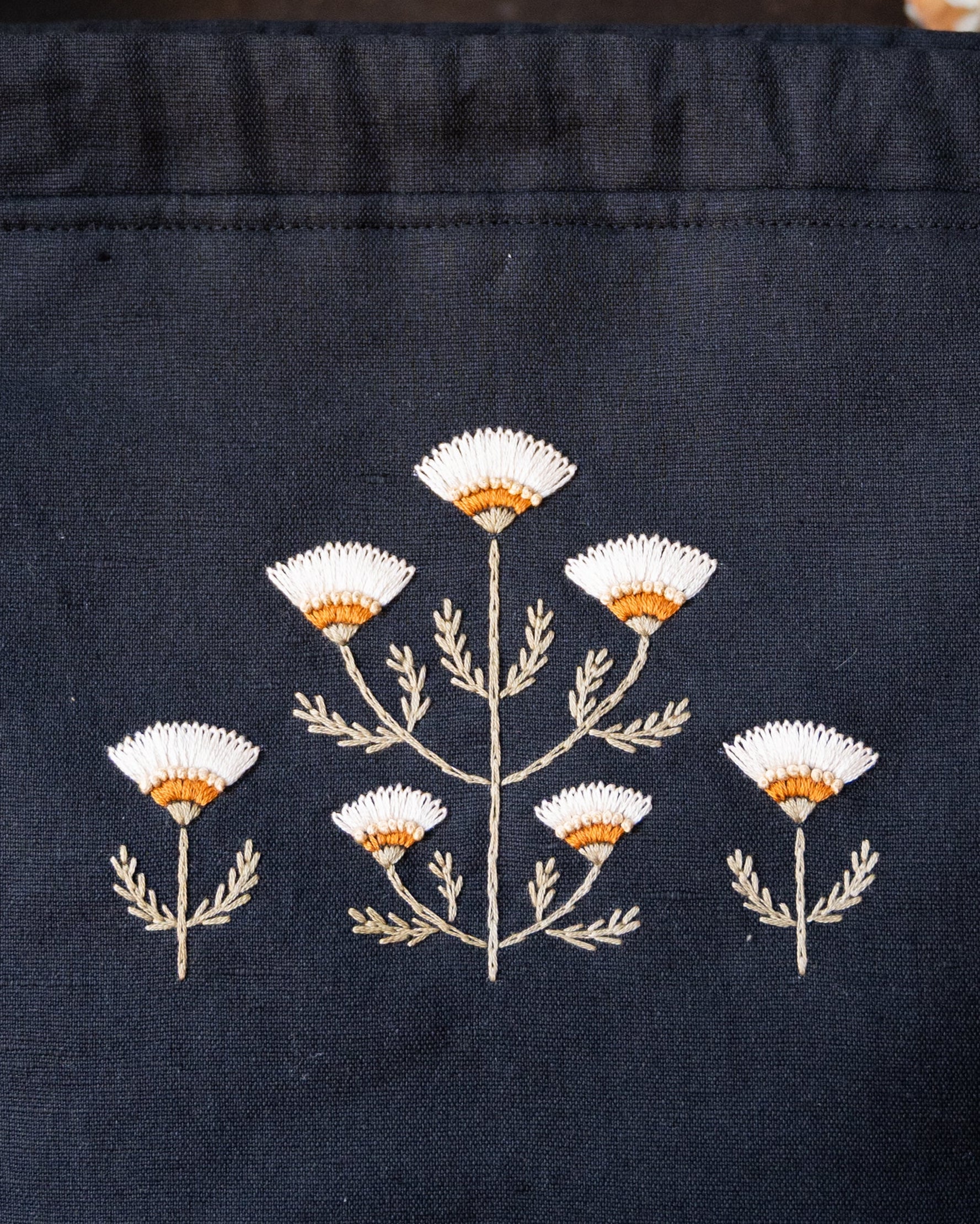 Large size knitting project bag with embroidered motif with three pockets inside and drawstring closure. It fits 6 100g skeins of yarn comfortably. Perfect for medium/large projects, like shawls, cowls, cardigans or any other similar sized signs of love and care :) Squared off bottom for stability and space. Interfaced. Lined with neutral linen/cotton fabric. Has a tab with metal detail for your favorite progress keeper.