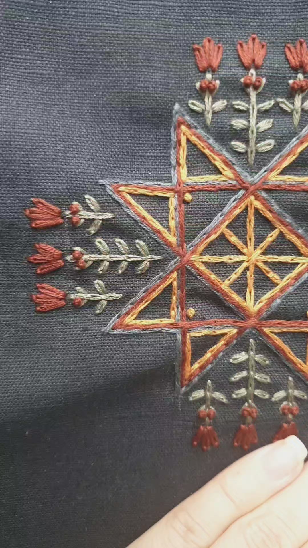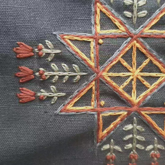 Small size knitting project bag with embroidered motif with two pockets inside and drawstring closure. It fits 2 100g skeins of yarn comfortably. Perfect for small projects, like mittens, socks, hats or any other similar sized signs of love and care :) Squared off bottom for stability and space. Interfaced. Lined with off-white striped cotton fabric. Has a tab with metal detail for your favorite progress keeper.