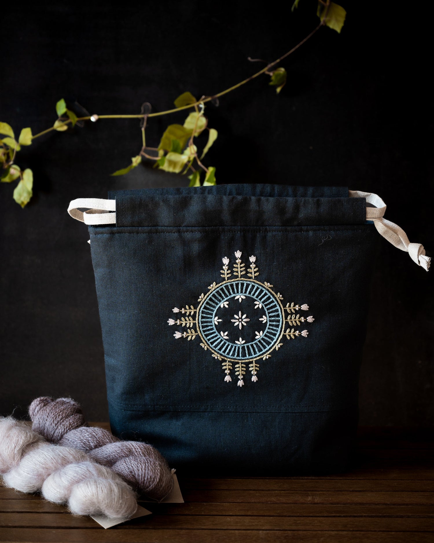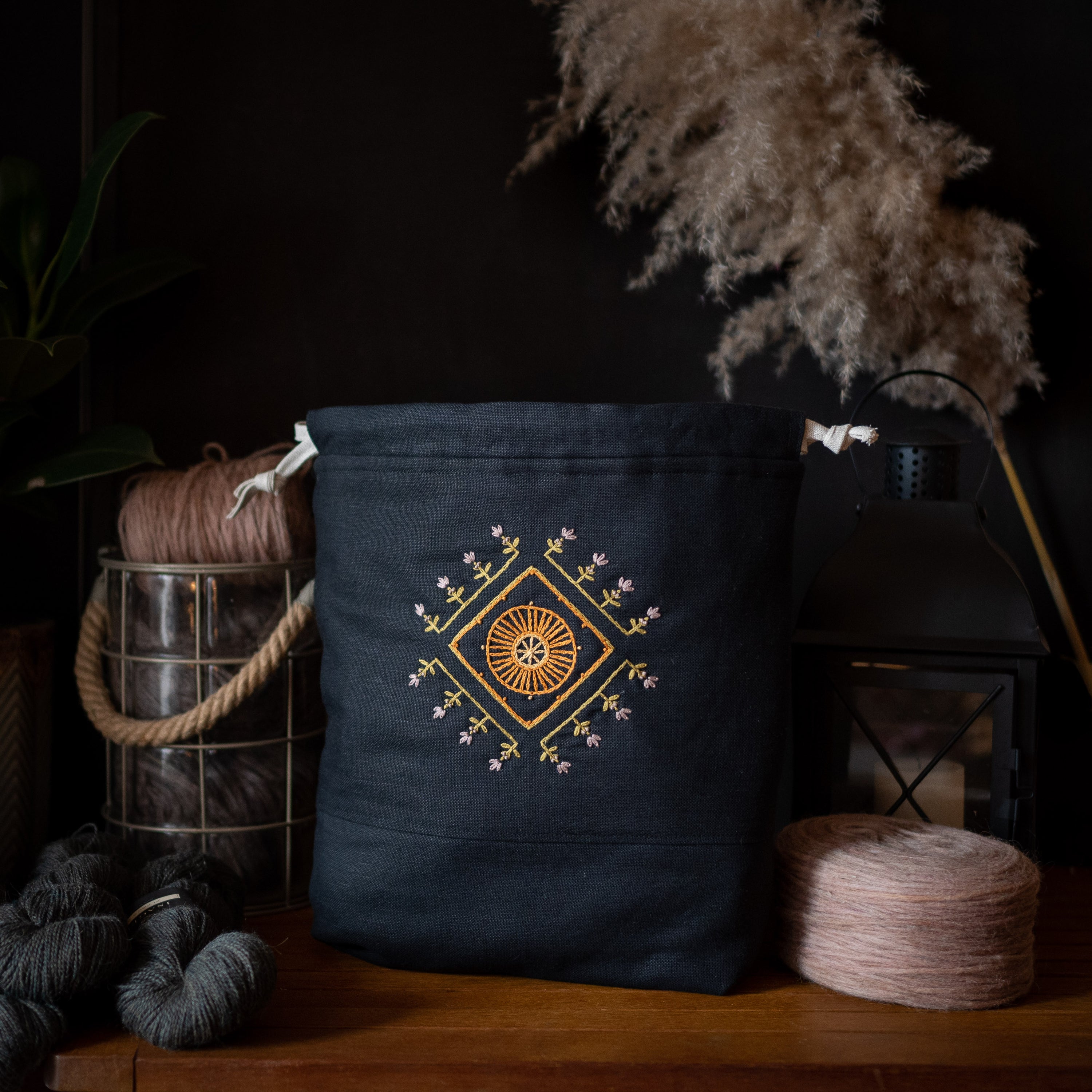 Large size knitting project bag with embroidered motif with three pockets inside...